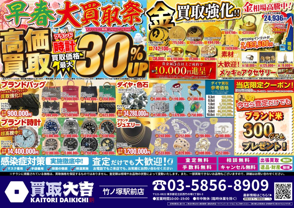 キャンペーン実施店舗 よくあるご質問 買取価格は主にどんな要素から決まるのでしょうか? お品物の状態や付属品の有無、最新相場、流通量などによって買取価格を算出します。 どんなものを買い取ってもらえますか? 金・貴金属・ブランド品はもちろん、お値段がつくか迷われているものも是非お持ちください。 傷や汚れのあるアイテムでも買取可能ですか? 大歓迎です。未使用品などのお持ち込みは少なく、傷や汚れのあるアイテムをお持ちいただく方が半数以上です。状態の悪いお品物やカビなどがあってもお買取可能なケースもございます。 どんな情報があればすぐに査定額を教えてもらえますか? お品物の名前や種類、状態、またはブランド名、型番などの情報があると、概ねの査定額をお伝えできるかと思います。 店舗での査定時間はどのくらいですか? お品物の種類や個数にもよりますが、約5分から30分ほどの査定時間となるケースが多いです。事前にある程度の査定時間をお伝えいたしますので、ご安心ください。